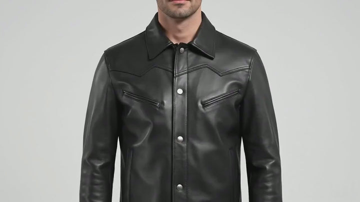 Black Cowhide Leather Trucker Jacket: Western Yoke, Snap Button