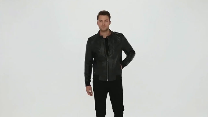Black Motorcycle Jacket with Custom Stitching | Stand Collar, Ribbed Cuffs, Quilted Liner