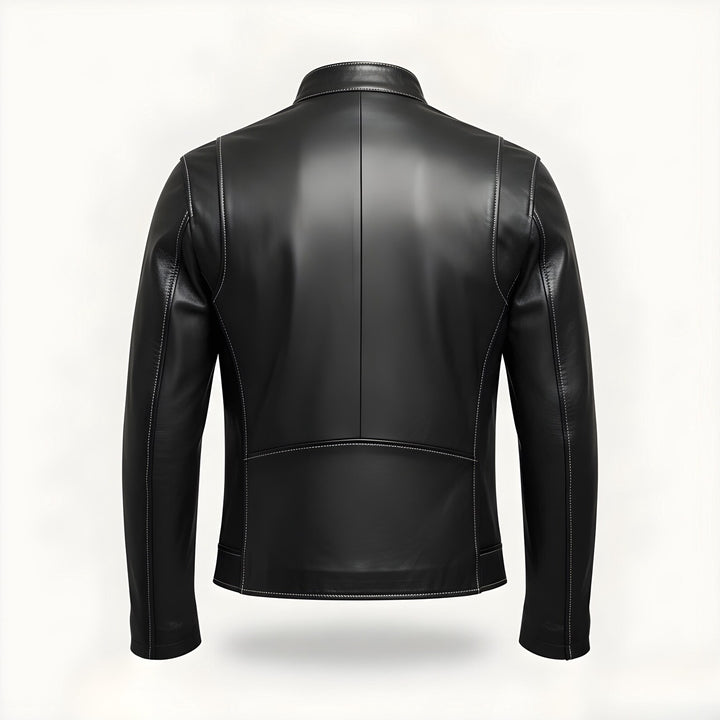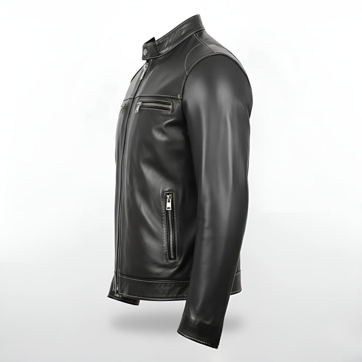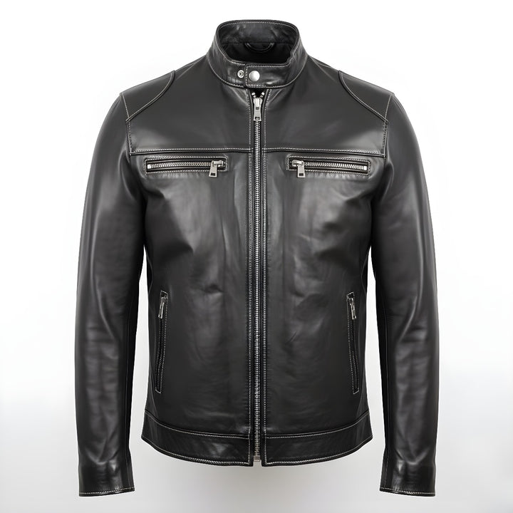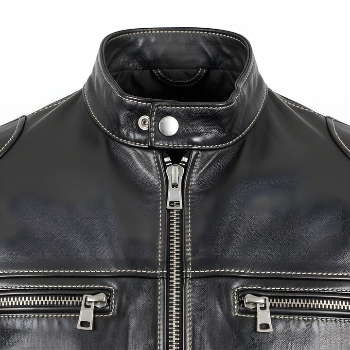 Men's Black Cowhide Leather Cafe Racer Jacket - Contrast Stitch Biker