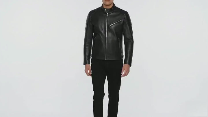 The jacket features quilted panels on the shoulders and upper arms, adding both texture and protection. A full-front zipper closure with silver-tone hardware complements the rich black leather, while the snap-button stand collar gives a sharp, confident edge.