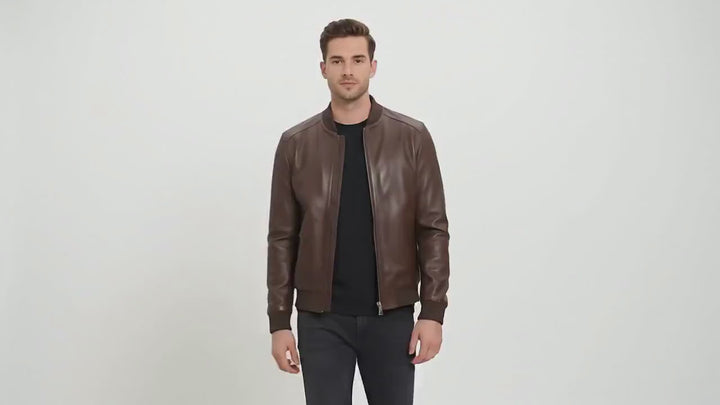 Men's Brown Leather Bomber Jacket | Classic Style with Rib-Knit Trim